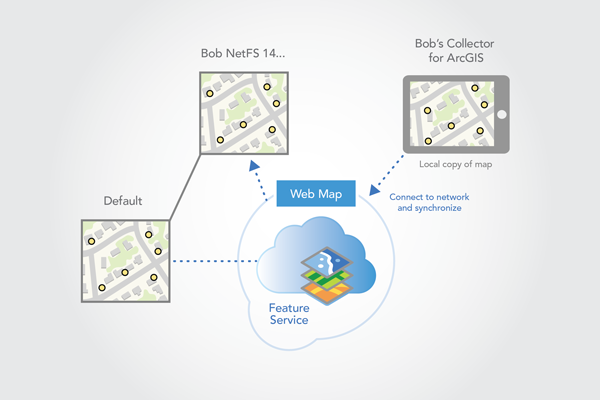 When the download process starts, a version named Bob_NetFS_1404578882000 is created from the published version (default) in the backend geodatabase. Because the service was set to create a version for each downloaded map, a unique version name is generated. The name is made up of the field worker's login (Bob), the feature service name (NetFS), and a unique ID. This version will be used when the downloaded map is synchronized.